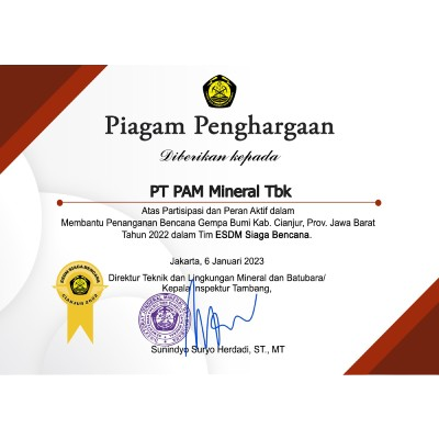 PT PAM Mineral Tbk meraih Piagam Siaga Bencana yang diberikan oleh Direktur Teknik dan Lingkungan Mineral dan Batubara sebagai tanda yang merujuk pada kesiapsiagaan bencana yang diwujudkan dalam berbagai bentuk, mulai dari persiapan pribadi dan institusi.