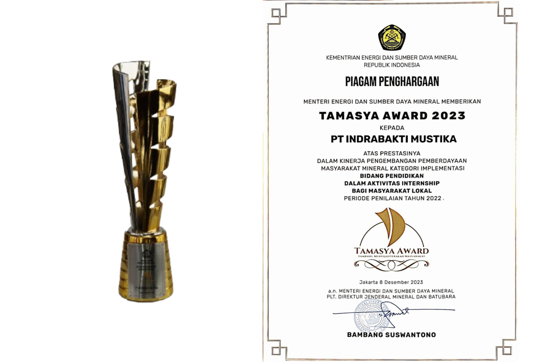 PT INDRABAKTI MUSTIKA meraih penghargaan Tamasya Award 2023 yang diberikan oleh Kementerian Energi dan Sumber Daya Mineral (ESDM) atas kinerja Pengembangan dan Pemberdayaan Masyarakat (PPM) bagi badan usaha pertambangan mineral dan batubara di Indonesia.